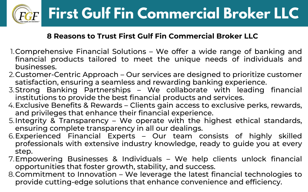 At First Gulf Fin Commercial Broker LLC, we are committed to empowering your financial freedom with personalized, reliable, and secure financial solutions. Let’s connect and explore how we can help you achieve your financial goals today.